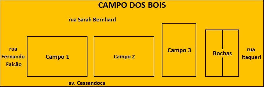 Conforme você pode ver no esquema abaixo, o campo número 1 era na rua Fernando Falcão com av. Cassandoca; o número 2 e o núao longo da av. Cassandoca e o número 3 (que veio bem depois) localizado nas esquinas da rua Itaqueri com a av. Cassandoca; junto a este existiam duas canchas de bochas descobertas. Como pode-se ver numa das fotos, atrás do campo 1 existia uma precária construção utilizada como vestiário pelos que se utilizavam desse campo.