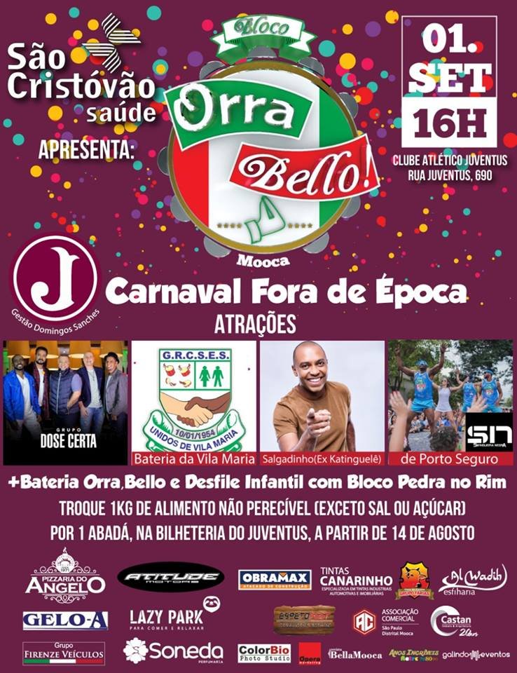 O Bloco Orra Bello! em parceria com o Clube Atlético Juventus, realizará dia 01/09 à partir das 16h, mais um evento familiar com a cara da Mooca.