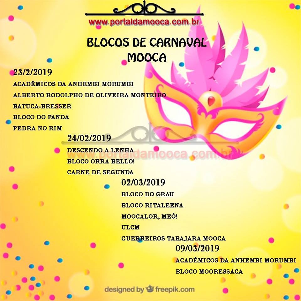 MOOCALOR, MEÔ! 2000 a 5000 Universitário 2/3/2019 13:00 Rua Taquari, altura do número 650.direita na Avenida Cassandoca, e se deslocará até, altura do n.º 400, onde ocorrerá o término e a Dispersão do bloco.