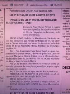 O prefeito Bruno Covas sancionou a Lei nº 17.160, calcada em projeto apresentado pelo Vereador Eliseu Gabriel, atribuindo o nome do saudoso mooquense delegado Osmar Porcelli à praça localizada nas confluências das ruas Celso de Azevedo Marques e Cônego Antonio Lessa.