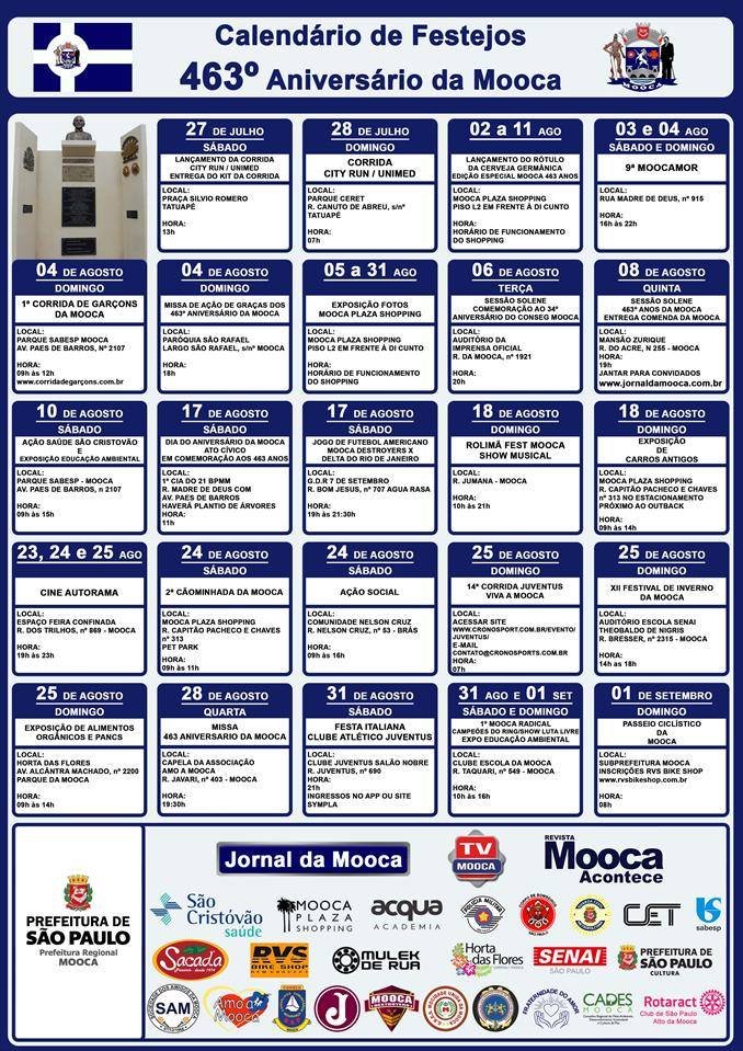 PROGRAMAÇÃO DE ANIVERSÁRIO DA MOOCA Mês de agosto terá uma intensa programação para comemorar o 463º aniversário da Mooca. Acompanhe : Portal da Mooca2019-07-29T19:40:24-03:00 Share This Story, Choose Your Platform! FacebookTwitterRedditLinkedInWhatsAppTumblrPinterestVkEmail Related Posts SACADA PIZZARIA CELEBRA 51 ANOS DE HISTÓRIA SACADA PIZZARIA CELEBRA 51 ANOS DE HISTÓRIA VOCÊ SABIA QUE O FAMOSO JOGO WAR NASCEU AQUI NA MOOCA? VOCÊ SABIA QUE O FAMOSO JOGO WAR NASCEU AQUI NA MOOCA? A HISTÓRIA DO LOCUTOR MOOQUENSE HÉLIO RIBEIRO A HISTÓRIA DO LOCUTOR MOOQUENSE HÉLIO RIBEIRO AS FESTAS JUNINAS ESTÃO CHEGANDO NA MOOCA AS FESTAS JUNINAS ESTÃO CHEGANDO NA MOOCA PROGRAMAÇÃO VIRADA CULTURAL 2025 PROGRAMAÇÃO VIRADA CULTURAL 2025