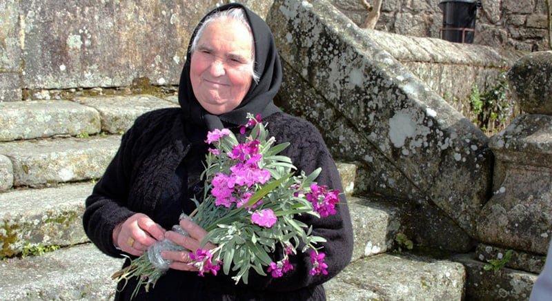 Chegando em frente à igreja, vi uma senhora com aquelas vestimentas pretas típicas das viúvas portuguesas, vindo em direção à praça. Estava com um ramalhete de flores silvestres. Achei a imagem muito bonita e já pensei em obter uma foto.